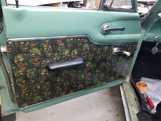 Keeping the outside patina on the car, I decided I would restore the interior. Keeping with the green I decided on the name for the car- "The Goon". The Goon is a comic series about some tough guy criminals (Franky and the Goon)who beat up monsters and zombies. I used the logo on the trunk emblem (since the original was busted) and made some custom ZOMBIE door panels. I was really happy how they turned out. Finished off with a full stereo, The car was fun to drive.